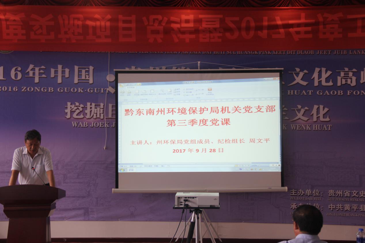 为扎实推动“两学一做”学习教育常态化制度化,充分发挥党员的先锋模范作用,根据2017年党员教育计划安排,9月28日,州环保局机关党支部组织全体党员进行了2017年第三季度主题党课和警示教育,局党组成员、纪检组长周文平同志授课。